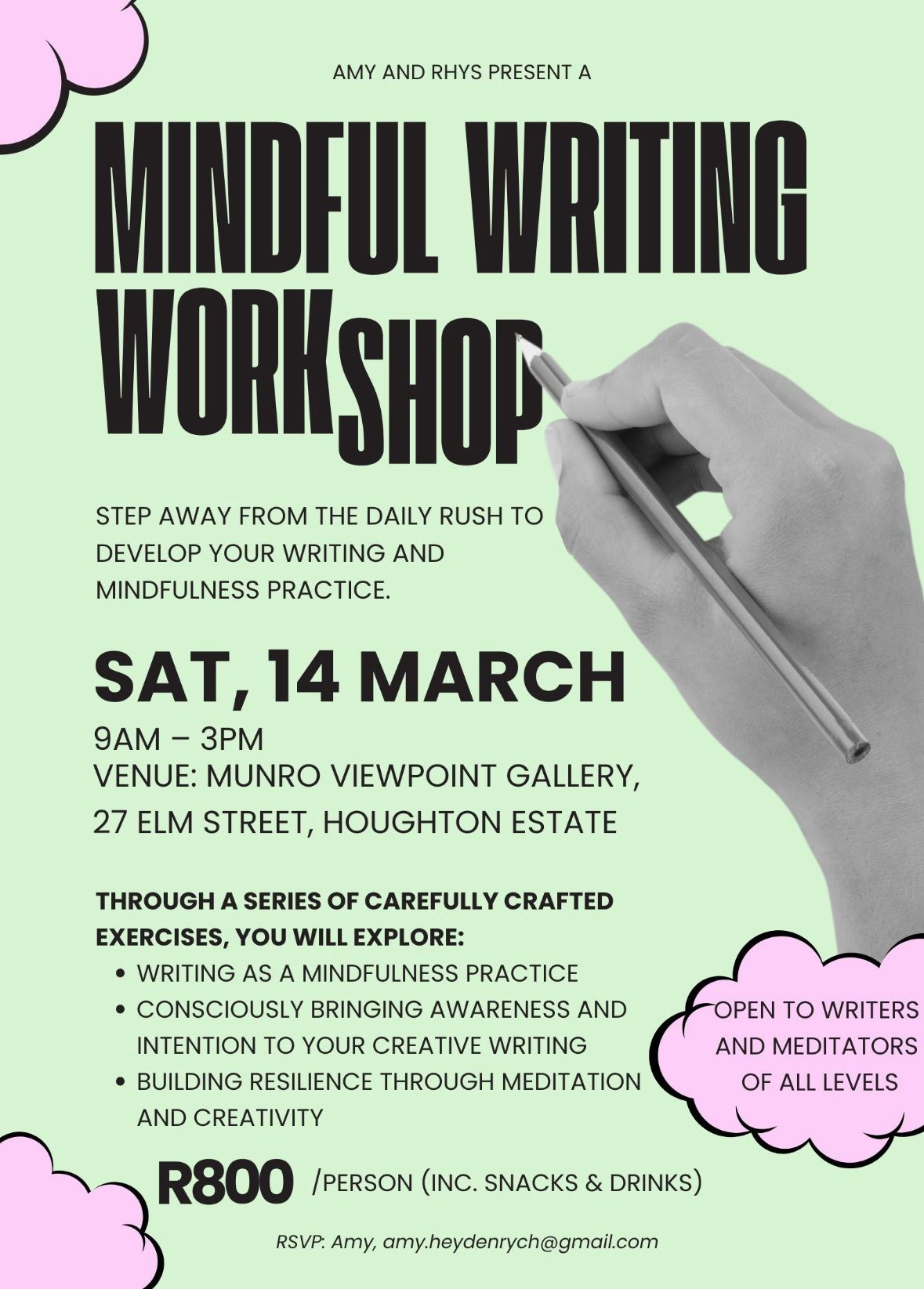 Then, the next Saturday Rhys and I are hosting our first mindfulness and writing workshop. We have two places still available, so if you are interested feel free to get in touch! For those of you who are joining us, you will receive final details by tomorrow morning. More below: